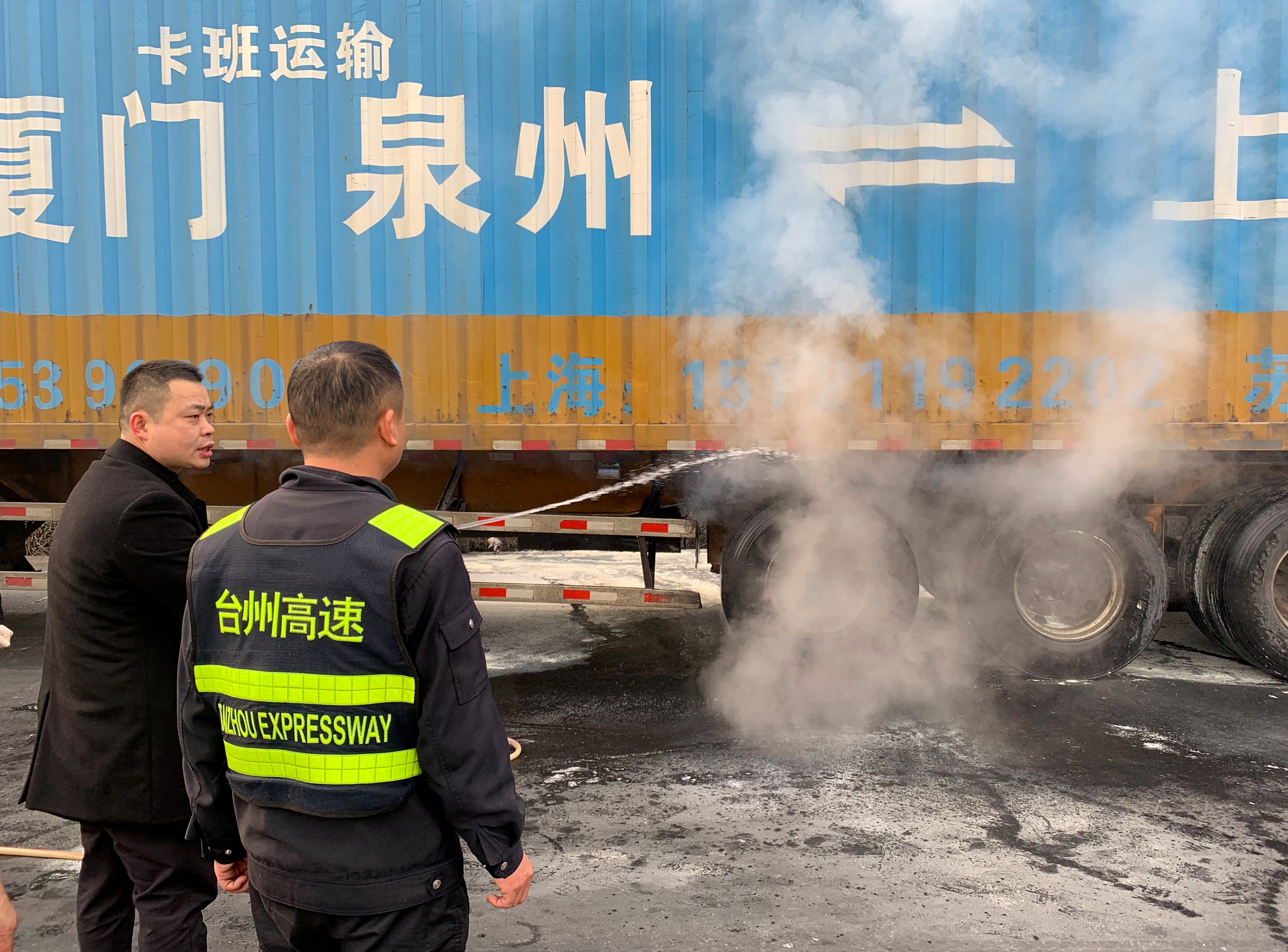 (圖為工作人員奮力救火) 就在這時(shí),突然又一聲巨響, 貨車輪胎發(fā)生二次爆炸,火苗再次復(fù)燃。但大家絲毫不畏懼,提起滅火器對準(zhǔn)著火點(diǎn),快準(zhǔn)狠,火苗再次被撲滅。現(xiàn)場,輪胎處還冒著白煙,監(jiān)控中心何先林提議利用車道上的兩根水管的水對車輛輪胎進(jìn)行沖水降溫,避免再次發(fā)生爆炸。 經(jīng)過長達(dá)半小時(shí)的緊急救援,火勢終于得到控制,無人員傷亡,車輛也沒有造成損失。據(jù)了解,該車起火原因是輪胎上有鐵絲,摩擦產(chǎn)熱導(dǎo)致輪胎爆炸起火。 “太感謝了,全靠你們發(fā)現(xiàn),及時(shí)止損,不然車就燒沒了。”駕駛員連聲道謝。 在此提醒廣大司乘人員,上高速前務(wù)必要對車輛進(jìn)行全面檢查,特別是輪胎、剎車等重要部位,避免行車途中發(fā)生故障導(dǎo)致嚴(yán)重后果。 任青青