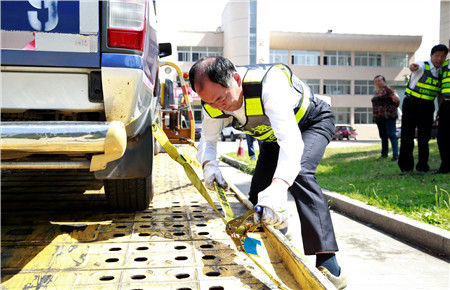 當哨聲響起時,清障作業(yè)的考試開始了。就象聽到路上事故的指令,選手們飛快躍上清障車,趕到“現場”,一組兩名員工,一名快速擺放隔離筒進行預警,一名趕到“事故車”前進行背拖拖曳作業(yè),綁帶作業(yè)、固定輪胎,甚至警燈、檔位、手剎、安全帶、巡視事故車等細節(jié)也有具體要求,雖然上午天氣涼爽,可因為比賽的速度比拼與現場緊張的氣氛,選手們額頭都冒出了熱氣。