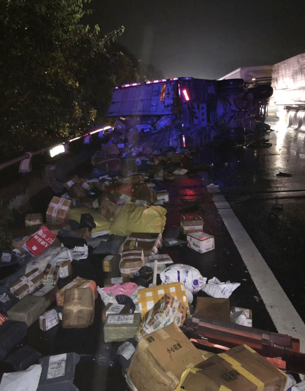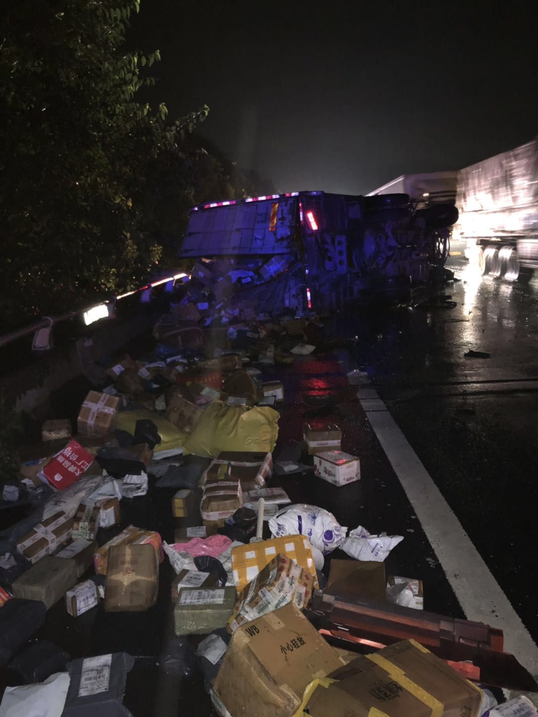7月14日凌晨1點,溫州方向臺州南收費所附近,一輛半掛型大貨車和一輛快遞車相撞,半掛車直接沖出高速,四腳朝天。快遞車則是被巨大的沖擊力撞向了硬路肩,側翻中撒下數十米的貨物。1點10分,救援車輛到達現場,現場一片狼藉,防撞護欄板、護欄柱損傷嚴重,橋梁鋼管都折斷了不少。