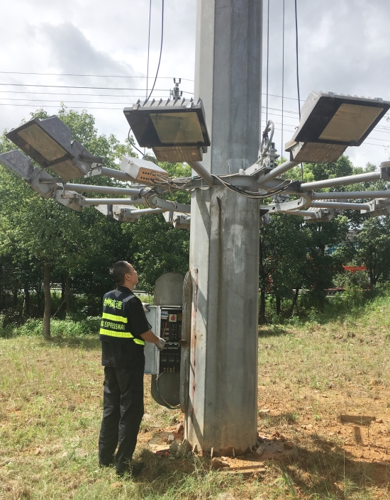 圖為工作人員清除收費頂棚垃圾 及時下降各收費所互通區(qū)高桿燈。為提升互通區(qū)照明亮度,減少因選錯路口而帶來的不必要的麻煩,集團在各收費站出入口互通區(qū)共安裝了11盞40米高度高桿燈,每盞高桿燈上方有12盞鈉燈。倘若這些高桿燈上鈉燈在臺風襲擊下一旦掉落后果將不勘設(shè)想。8月8日,中心再次召集各班人員對收費沿線高桿燈進行了下降處理。因高桿燈四周雜草叢生,在下降時維修隊員不僅要忍受底下蚊蟲肆意叮咬,還要克服時而烈日時而大雨的怪異天氣,沒放幾盞隊員便濕透了全身,衣服是濕了又干,干了再濕。
