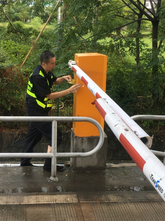 圖為工作人員下降各收費所互通區(qū)高桿燈 增強機電設(shè)備防水措施。集團收費站有很多機電設(shè)備直接安裝在戶外,因外層有開關(guān)柜保護,一般雨水是無法滲透的。可一旦遇上臺風雨等惡劣天氣就很難確保內(nèi)部設(shè)備不會被打濕,尤其是計量柜里面的計重設(shè)備,一旦短路損壞會立即造成車輛擁堵。因此,剛完成高桿燈下降工作的中心隊員顧不上休息,又馬不停蹄趕赴收費所將計量柜、欄桿機等重要設(shè)備用封帶紙進行密封處理,不漏過任何一處可能進水的地方,大大增強了這些設(shè)備防水性能。